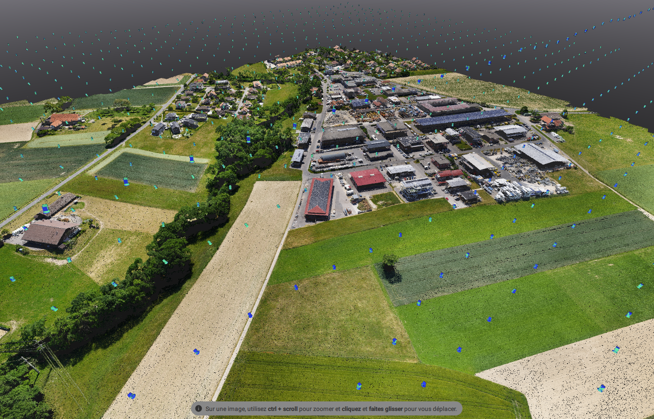 Les images en haute résolution du drone vont permettre de créer un jumeau numérique fidéle à la réalité, pour différents usage, exemple dans le cas d'un bâtiment, on peut conserver le jumeau numérique en y annotant des Points d'Intéret pour un repérage plus facile lors d'inspections, il peut également y faire des mesures très précises à des fins de futurs travaux.